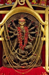 Kamardanga Sitalatala Baroari in Santragachhi, referred to as aguner pandal, depicts the goddess in the rage that brought about the destruction of evil. Brahma and Vishnu recline near the entrance, with Maheshwar looming above. The rage of the three gods is believed to have created Durga.