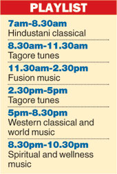 In the afternoon, there is a three-hour slot for fusion music, including compositions by Bickram Ghosh, Rahul Sharma, Richard Clayderman and Kadri Gopalnath. The next couple of hours before the evening rush from 5pm are dedicated to Tagore tunes, followed by an eclectic mix of western classical and world music till 8.30pm.