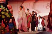 The show started off with models strolling to the tune of Purano sei diner kotha, flaunting creations by local hero Sabyasachi Mukherjee. A few saris from The Snail collection that Sabyasachi showed at the Lakme Fashion Week (LFW) recently, rubbed shoulders with gherdaar kurtas and churidars. A show-stealer was the ivory-and-black outfit made famous by Rani Mukherjee at LFW. Off-whites, beiges, black and moss green defined the palette.