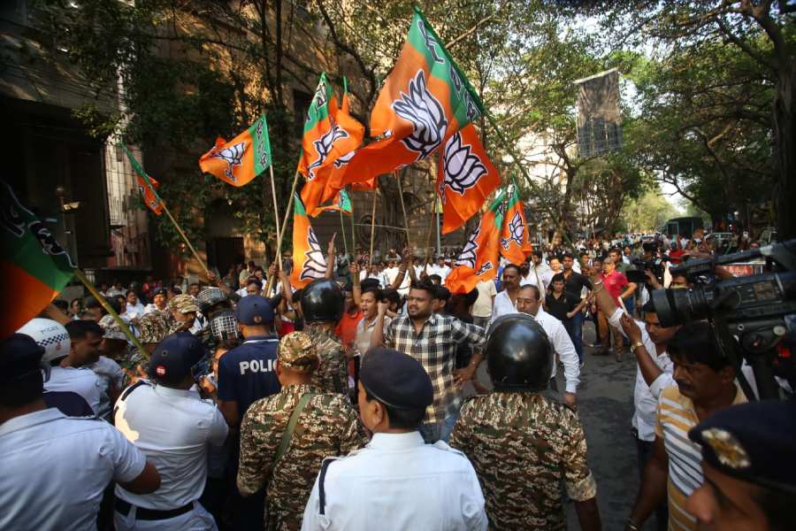 BJP supporters outside CEO office in Kolkata on Tuesday, March 31, 2026. (Amit Datta)