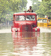 A neighbourhood 15km from the heart of Calcutta has been flooded for over a fortnight, putting the elderly under house arrest, forcing gumbooted mothers to ferry schoolchildren on their backs and making an extra pair of shoes mandatory for the office-bound.