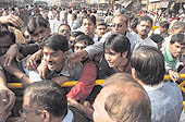 | Traders clamour for coupons to enter Nandaram Market when it was opened to them on Thursday. A Telegraph picture |