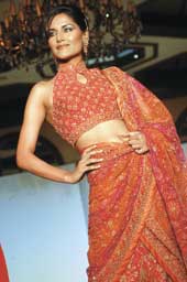 | A model sports a zardosi-embroidered sari by Ritu Kumar. Picture by Rashbehari Das |