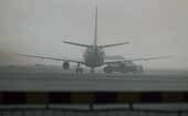 | Fog envelops the Calcutta airport runway early on Tuesday. All morning flights were delayed while Monday night flights were diverted. (PTI) |
