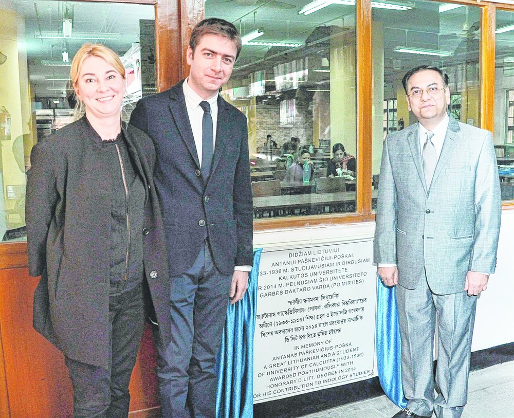The ambassador of Lithuania, Laimonas Talat-Kelpsa, poses alongside a marble plaque he unveiled in the library of Calcutta University on Friday. With him are his wife Alina Taluntyte and Arvind Sukhani, who liaised with the university for the installation of the plaque on behalf of Lithuania. The plaque commemorates the conferring of a DLitt degree on anthropologist Antanas Paskevicius-Poska last November for his contribution to Indology studies by the university, where he did his postgraduation and even started his PhD in the mid-1930s. 'Imagine a man starting off from Lithuania on a bike with India as his destination in an age when communication was so difficult. Today his name is embedded in a corner of Calcutta,' said the ambassador. 'We wanted his name to stay in a place where generations of students can see it and learn of his contribution. This reflects back to our glorious past when students from so far abroad came to CU,' said the pro-vice chancellor for academic affairs, Dhrubajyoti Chattopadhyay, who was also present. Picture by Anup Bhattacharya