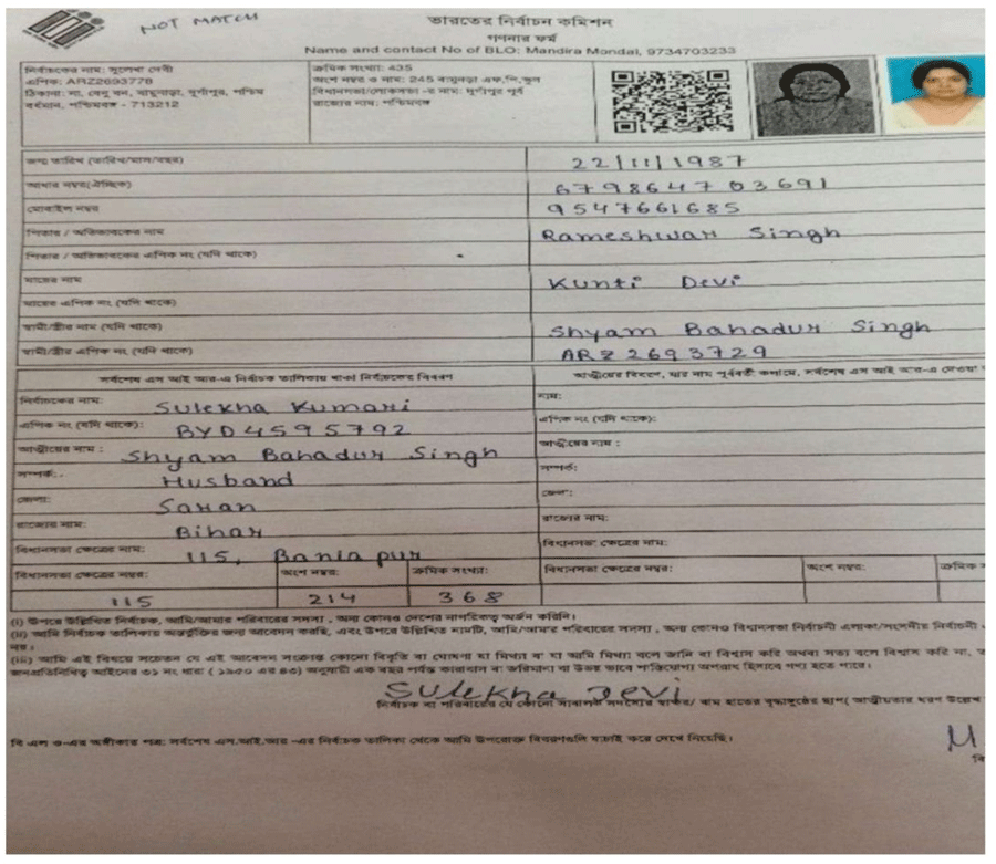 The five voters Bengal’s ruling party cited as duplicate are named Sulekha Kumari, Umesh Yadav, Shyam Bahadur Yadav, Dolly Devi and Kumud Singh.