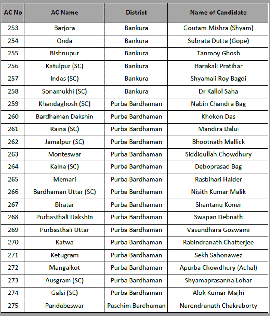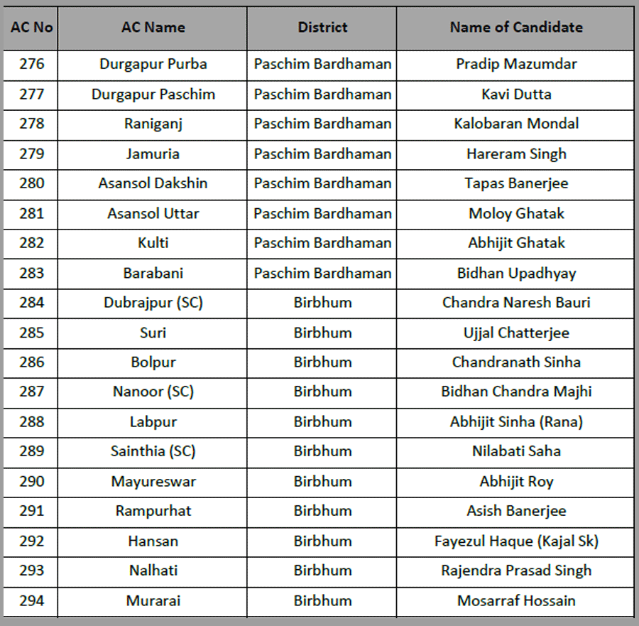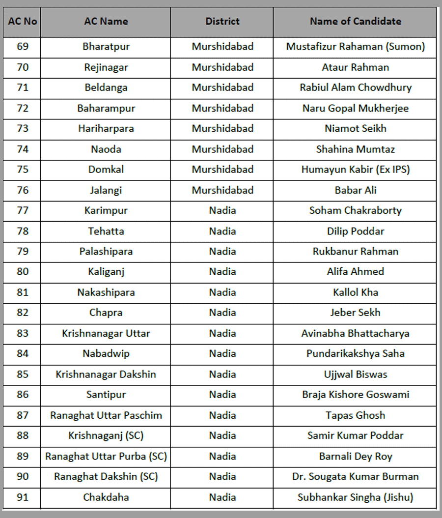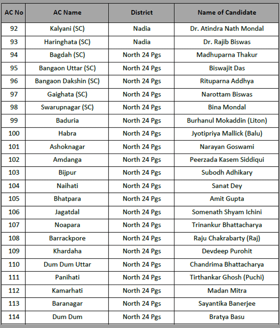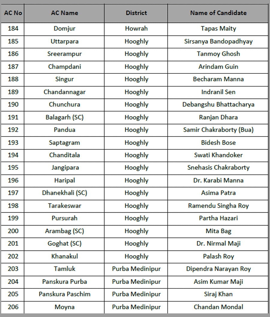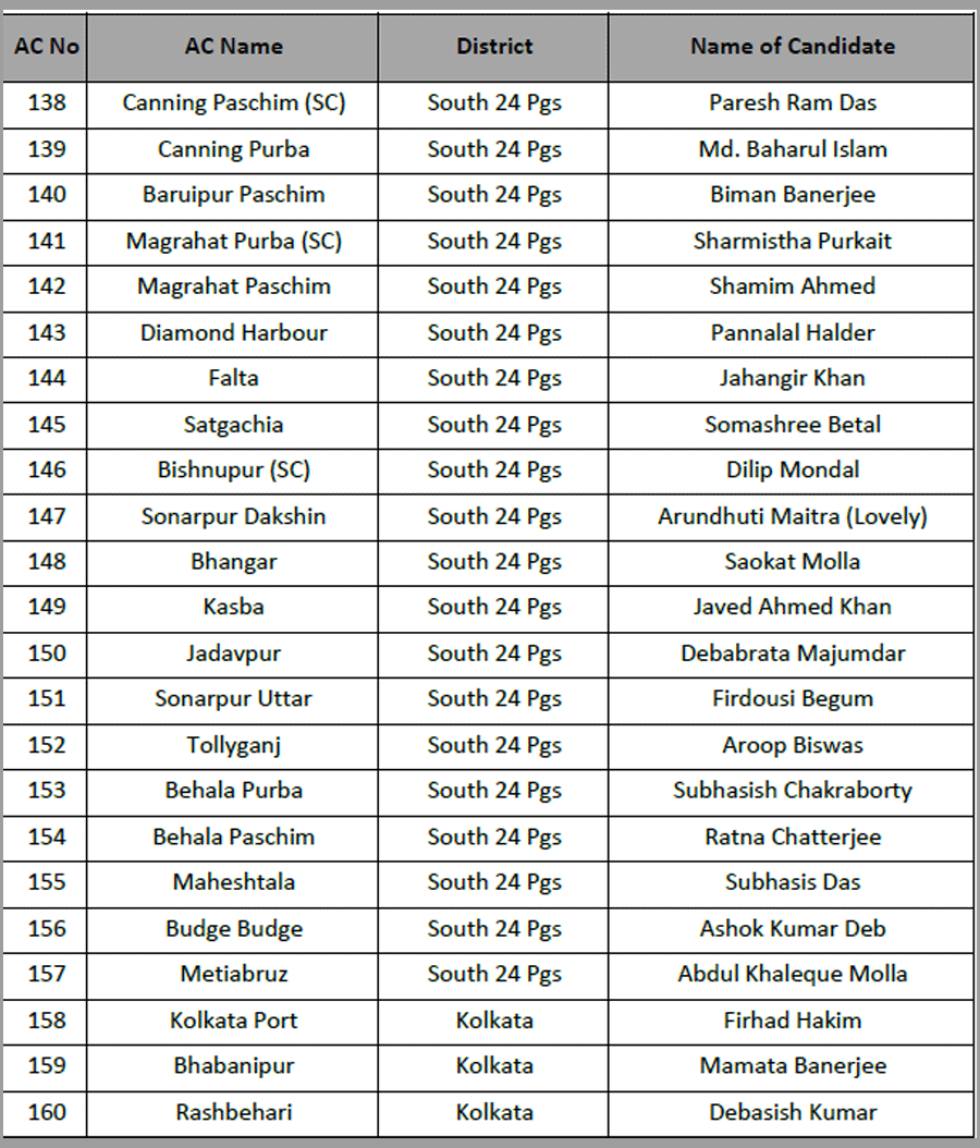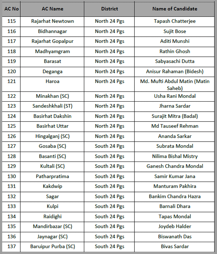Narayan Goswami fielded from Ashoknagar. Raj Chakraborty form Barrackpore. Chandrima Bhattacharya from Dum Dum North.