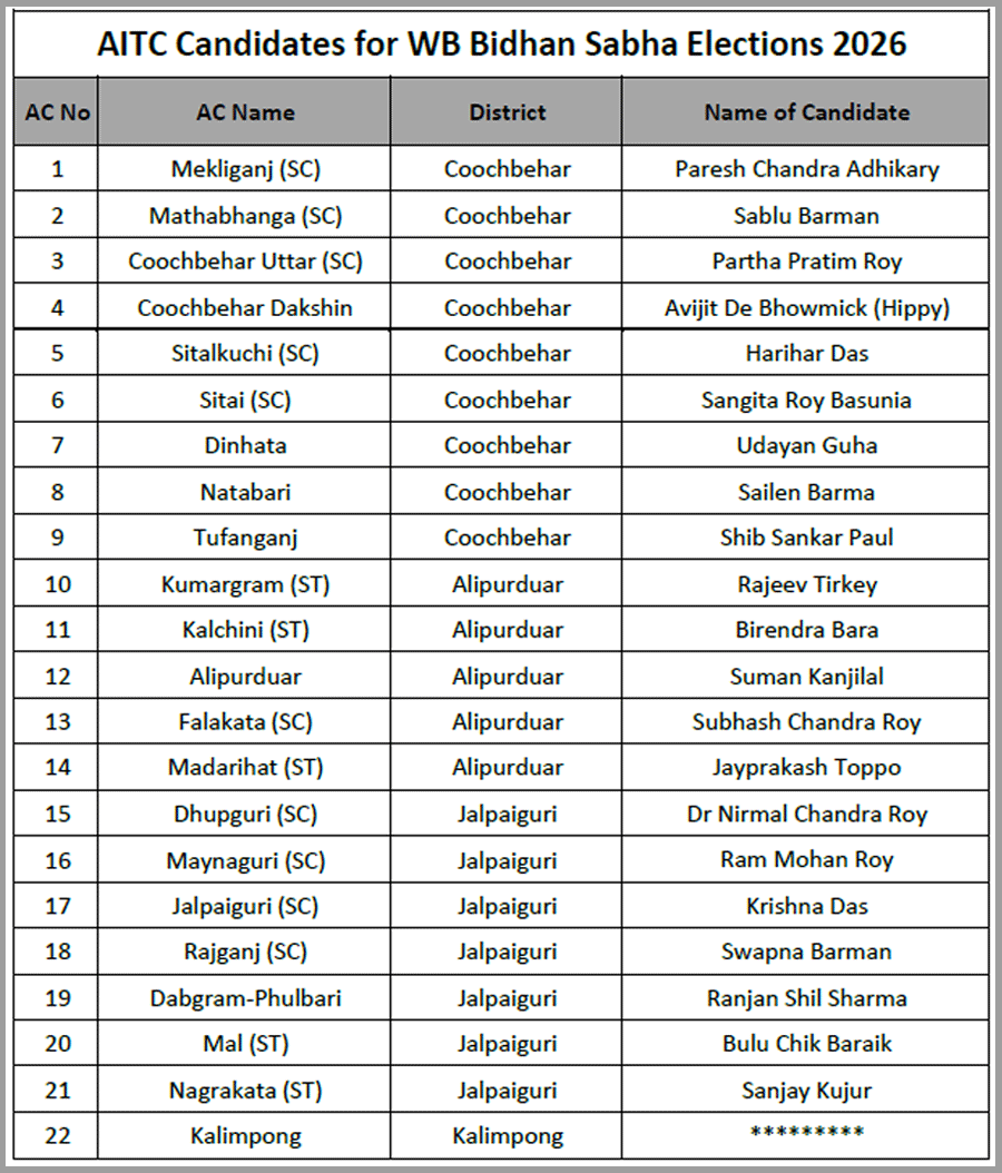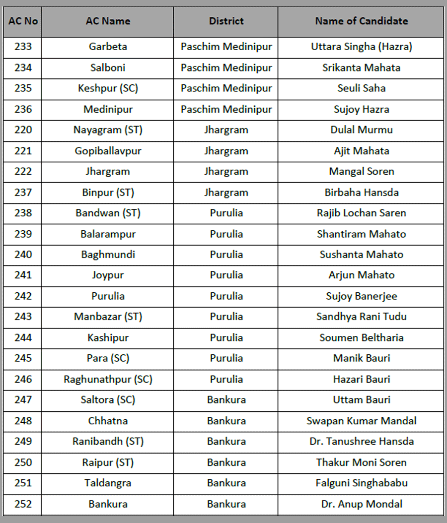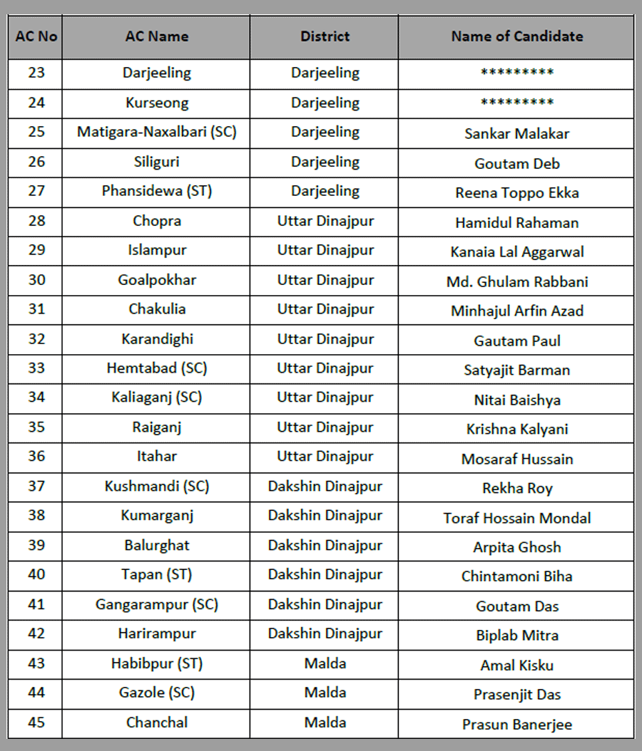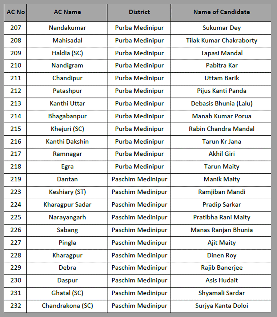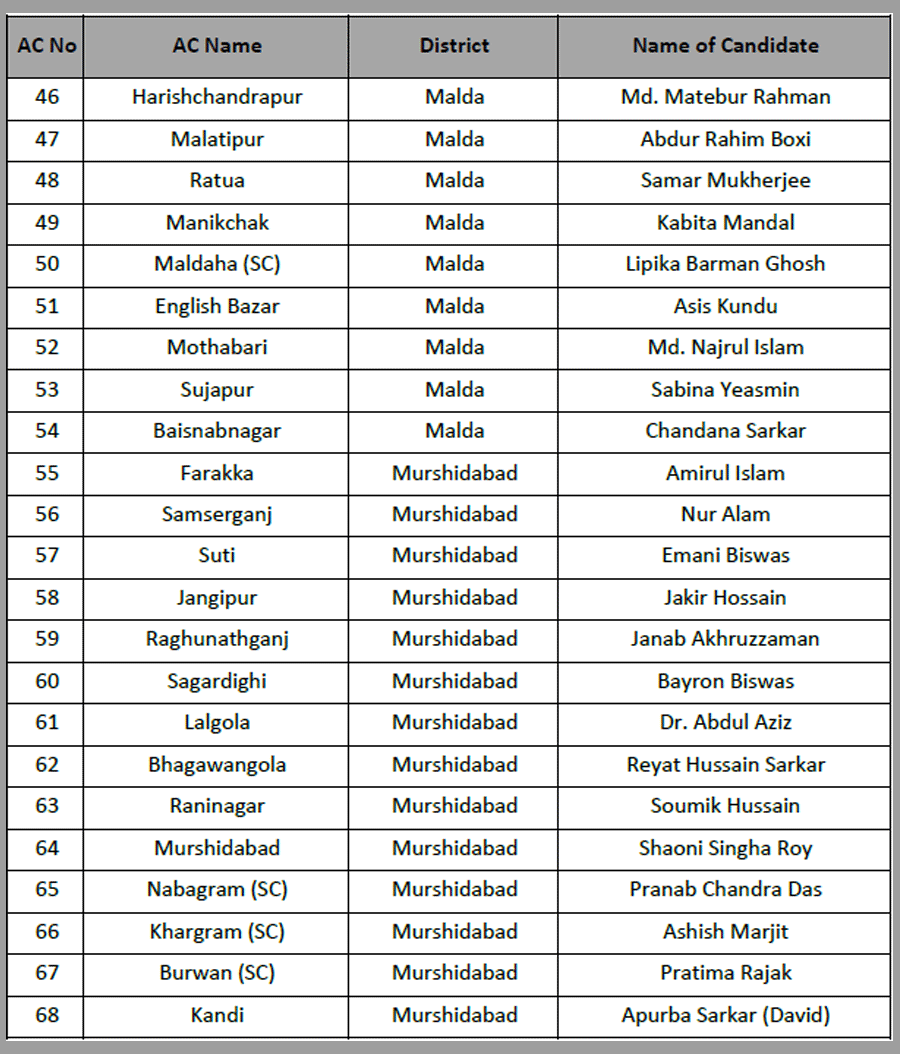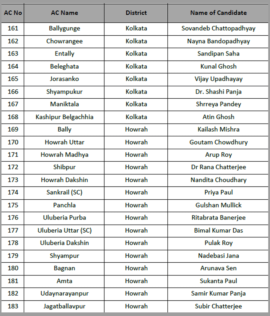 Narayan Goswami fielded from Ashoknagar. Raj Chakraborty form Barrackpore. Chandrima Bhattacharya from Dum Dum North.