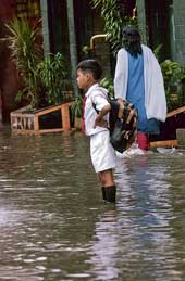| MAKING WAVES: A girl on her way to school is delighted at the water her car wheels are ploughing through on Friday morning. Picture by Amit Datta |
