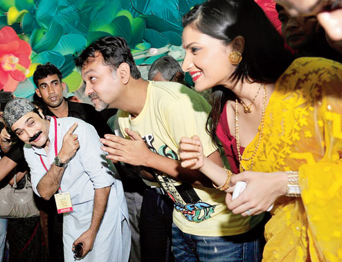 | Prosenjit, Srijit Mukherji and Tanusree at Santoshpur Lake Pally, which was crowned True Spirit Model Puja 2013. Picture by Rashbehari Das |