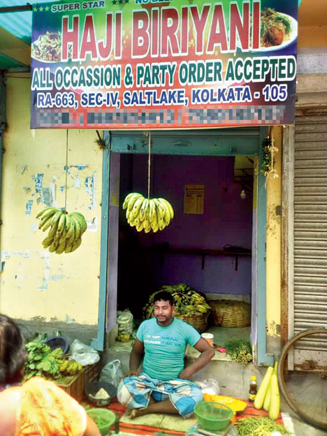 The picture shows the facade of a Haji Biriyani outlet in RA Block. This is in Sukantanagar, near Chingrihata. But instead of biryani handis being laid out, a lungi-clad man sits on the ground outside, selling fruits and vegetables. Bananas hang from the top, gourds lean against the wall and more fruits are seen stored inside the shop.