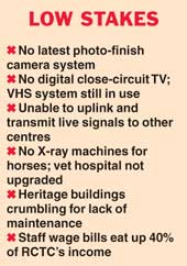 The support-base for the sport has narrowed, with many prominent owners having bolted. And the ‘heritage’ institution, contributing more than Rs 7 crore to the state exchequer every year by way of various taxes, is struggling to meet galloping wage bills and has no money to invest in mechanisation. The loss of the Invitation Cup to Bangalore in 2000 has cost the club dear, scotching hopes of hosting the mega event in the near future.