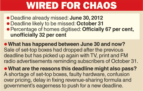 “It’s all working out to the cable operator’s advantage. The October 31 deadline is looming but unlikely to be met, set-top boxes are in short supply and there is confusion over the pricing policy for digital feed. The situation is ripe for exploitation and some are cashing in,” said an official of a multi-system operator.