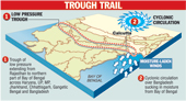 In addition, a trough of low pressure is lying over a huge area — from Rajasthan to the north Bay of Bengal, spanning Haryana, Uttar Pradesh, Madhya Pradesh, Jharkhand Chhattisgarh, Gangetic Bengal and Bangladesh (see graphic).