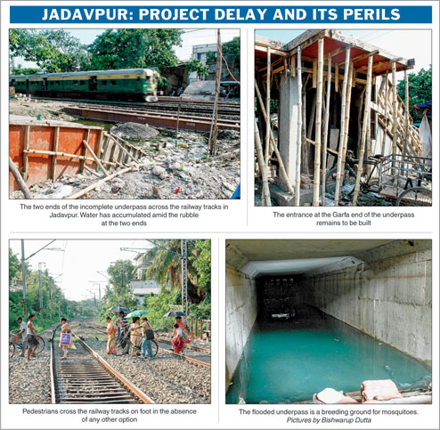 Work on the underpass connecting KS Roy Road at Jadavpur and Jheel Road at Garfa across 15m-wide railway tracks started in August 2011 and was supposed to be completed by the end of the year.
