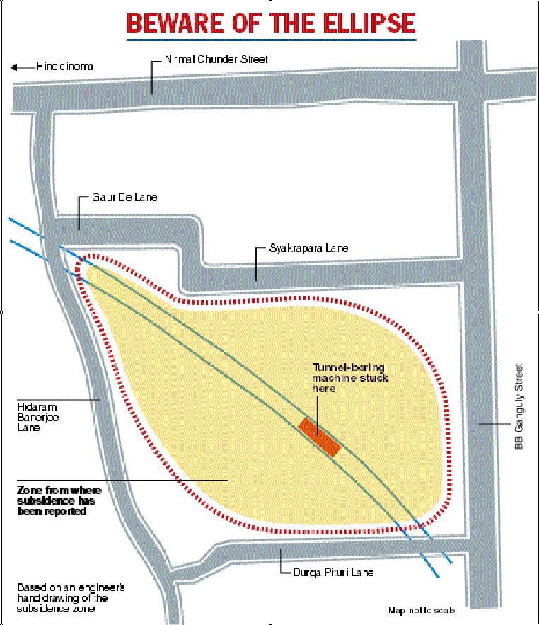 Geo-technical analysts and engineers have found that the subsidence zone in Bowbazar has taken the shape of an ellipse and are trying to prevent its spread by building a concrete underground wall around it.
