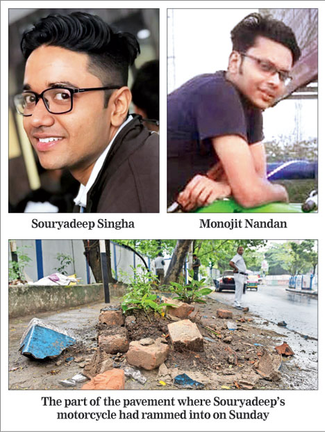 Souryadeep Singha, a first-year student at the Indian Institute of Hotel Management, was riding the bike without a helmet. So was pillion-rider Monojit Nandan, who suffered critical head injuries.