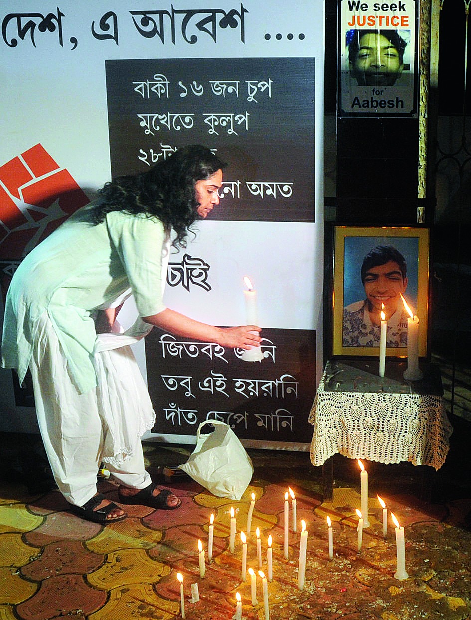 Rimjhim Dasgupta lights a candle on Tuesday in front of a picture of her son Aabesh, who died exactly a month ago after suffering an injury during a get-together at Sunny Park Apartments."I have vowed to see the end of this.