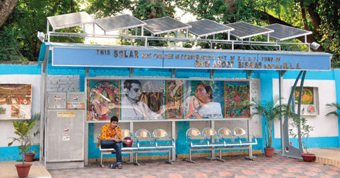 | A solar-powered bus stop on Uday Sarkar Sarani in Golf Green, (below) a mobile phone charging point in the shelter |