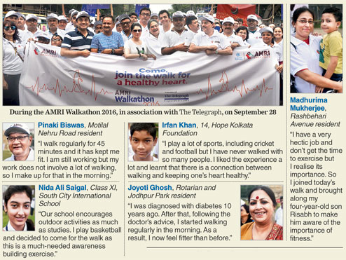 School students, senior citizens, sportspersons and children from NGOs matched steps with celebrities and cardiologists at AMRI Walkathon 2016, in association with The Telegraph, on September 28. About 400 people participated in the inaugural edition of the walk that Rupak Barua, group CEO of AMRI Hospitals, said would become an annual event around the World Heart Day on September 29. About 100 walkers were Rotarians, who co-organised the event with AMRI. “Walking is the cheapest and most basic form of exercise. Anyone can walk anywhere without need of any equipment or infrastructure. The benefits of walking are many: it helps you reduce weight, fights lifestyle diseases like diabetes and hypertension and automatically makes you healthier,” said cardiologist Susmit Bhattacharya who took part in the walk. Among the familiar faces in the walk from Deshapriya Park to Vivekananda Park via Rashbehari Avenue and Triangular Park were former cricketer Sambaran Banerjee, former footballer Gautam Sarkar, grandmaster Dibyendu Barua, singer Usha Uthup