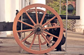 Resting on its teakwood wheels, the cannon nozzle can now be manoueuvred and moved up and down.