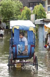 | A child is off to school on a cycle-rickshaw down a flooded Behala road. Picture by Pradip Sanyal |