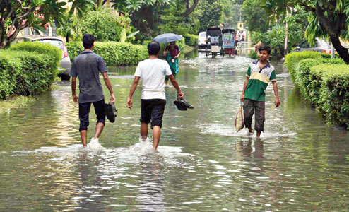 Pedestrians at Karunamoyee Bus Stand are being nudged by gentle waves these days after every few hours of rains. “Sector V is flooded and no autos are plying from there. I somehow managed to board a very crowded bus from my office there to Karunamoyee and even here there is so much water! I don’t know how I’ll wade to the S9 bus stand opposite Bidyut Bhavan,” said Priyanka Mukherjee, as the water rose above her ankles.