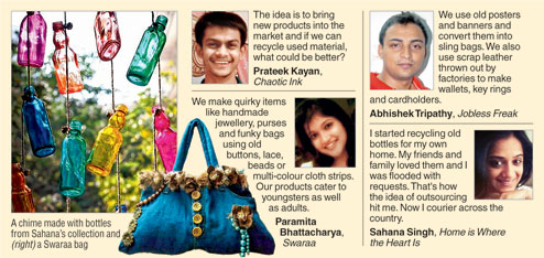 What do you do with that pair of old jeans lying in your cupboard? Or the empty bottles gathering in your balcony? How about the newspapers you’ve been meaning to sell off? A clutch of youngsters from the city is recycling everything from scrap leather to buttons from old clothes to make a variety of products. Green deed done, profit made!