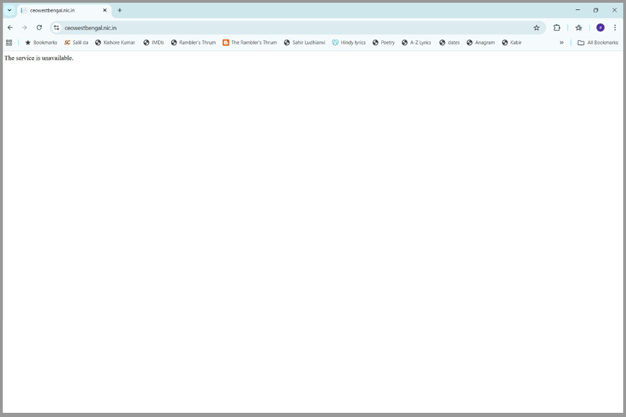 Multiple clicks on http://www.ceowestbengal.nic.in threw the same result. A single sentence on the left corner of the page: The service is unavailable. A little while later, that message changed to “HTTP Error 404. The requested resource is not found.”
