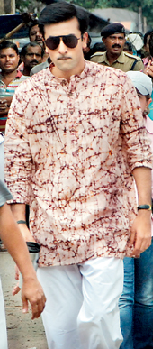 | A flower market overlooking Howrah bridge had two unlikely visitors on Tuesday — Ranbir Kapoor and Priyanka Chopra. The stars of Anurag Basu’s Barfee spent the day on the terrace of Ganga Seva Samiti Bhavan at Jagannath Ghat, he in a beige and maroon kurta and sporting a thin moustache and she in red kurti, linen trousers and a scarf around her head. As word spread and the crowd jostled for a glimpse of the Anjaana-Anjaani pair, a security ring kept shutterbugs and fans at bay. Having shot in Darjeeling and its adjoining areas in June, Team Barfee plans to camp in Calcutta this week and shoot hush-hush in various parts of the city. Pictures by Sayantan Ghosh |