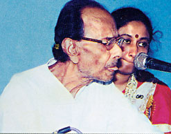 | (Left) Arjun Chakraborty and Swagatalaxmi Dasgupta sing for Bidhannagar Sanskriti Angan at EZCC, (below) a chorus performance by HA Block Residents Forum. (Right) Dr P.B. Sarkar demonstrates his interactive Gitabitan Archive DVD at Rabindra Tirtha, New Town. (Saradindu Chaudhury and Mayukh Sengupta) | |