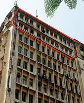 | The top two floors (in red) of 23A NS Road were added in the mid-70s, but they have no access to the lift or the rear exit. The building that houses Stephen Court Ltd is a maze of wires, air-conditioners and cubby holes. (Amit Datta and Sanat Kr Sinha) |
