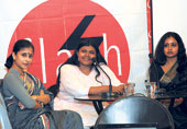 | (From left) Momm Bhattacharya, Raka Dutta and Trina Nileena Banerjee at the screening of Dutta’s Chinese Whispers at Oxford Bookstore. Picture by Amit Datta |