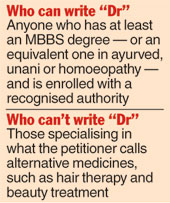 “Body-weight reducers, hair therapists and even some beauticians using herbal products are writing ‘Doctor’ before their names. They do not have any degree from recognised medical institutions,” the petition states, calling for a ban on such disciplines.