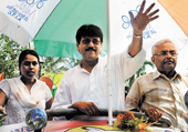 The smile and the wave come as easily to Chiranjit the politician as to Chiranjit the actor. He greets the milling crowd of starry-eyed residents and shopkeepers rushing out of their stores, some with daab and others with bottles of soft drink. The trail grows longer as the van with loyalists hanging from the back of the vehicle cuts through the cramped bylanes.