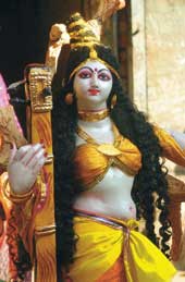 Stop Two: Kalighat Potuapara. If the trip-up at the style temple was due to lack of wisdom about the rights and wrongs of rituals, it is sheer market mechanics that rule at the second biggest hub of artisans in the city. Indrajit Sinha has laid out his choicest pair of creations in front of his studio. In the middle of a sea of idols all around, benign and in benison mode, the two stick out for chutzpah. The three-and-a-half-ft high things of buxom beauty in choli and ghagra (flowing from well below the divine navel) are priced around Rs 400. ?I have based them on models since that is an upcoming profession,? smiles the 19-year-old, who graduated from assistant to lead artiste three years ago. But they hardly look like goddesses! ?Actually I am trying out a new look. Let?s see if customers like it,? says the youth, in slight discomfiture. Two other idols in the same style have already been scooped up by customers, inform artisans from neighbouring studios. Take a bow, Yana Gupta.
