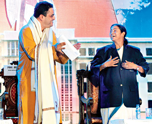 | Mamata Banerjee, in her St. Xavier’s blazer, shares a laugh with education minister Bratya Basu at the foundation ceremony of the Park Street institution’s Rajarhat campus on Friday. Picture by Sanjoy Ghosh |