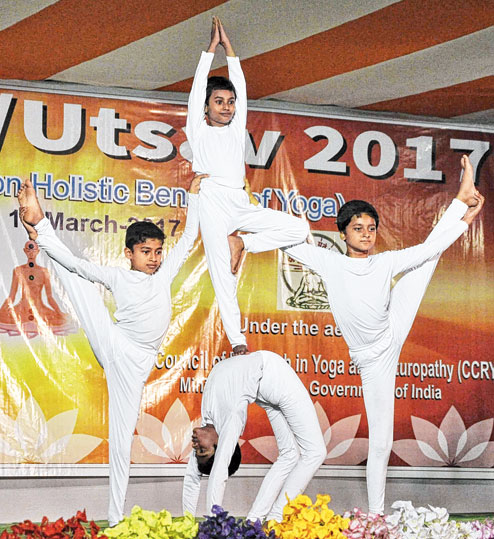 Children perform on the opening day of Yoga Utsav at Ramakrishna Mission Vivekananda University (RKMVU) in Belur on Friday; (above) Swami Atmapriyananda, vice-chancellor of the university, felicitates a member of the Kalaripayattu team (an ancient Indian martial art based on Hatha and Raja Yoga) from RKMVU, Coimbatore, after they showcased their skills. The Utsav will continue till Sunday. Pictures by Anup Bhattacharya