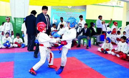 National High School for Boys and Salt Lake Shiksha Sadan were joint third. Japanese consul general in Calcutta Masayuki Taga was the chief guest on the occasion. "Karate is now an Olympic game. Our aim is to raise talents and produce some young karatekas who will win medals for India at the Olympics," said Premjit Sen (in suit, facing camera), the president of Karate Association of Bengal and also the chief judge of the tournament. Picture by Biswajit Kundu