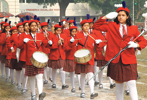 | The marching band of Shaw Public School at the school’s annual inter-house athletic meet at the Oxford Mission School grounds in Behala on December 4. Picture by Bishwarup Dutta |