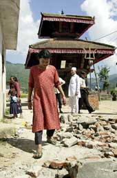 | A Nepalese girl walks through debris caused by a bomb blast at Sankhu, 28 km northeast of Kathmandu. (AFP) |