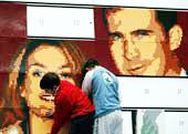 | Children complete a giant puzzle of Princess Letizia Ortiz and Prince Felipe in Madrid. (Reuters) |