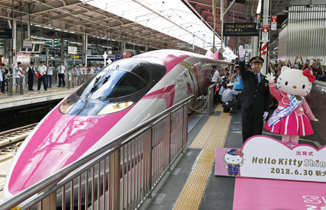 Tokyo, June 30 (AP): A Hello Kitty-themed "shinkansen" bullet train has debuted in Japan. Adorned with the cartoon icon inside and out, it's a dream ride for fans of the internationally popular character.
