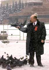 | A Lenin lookalike feeds pigeons in Moscow. (Reuters) |