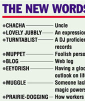 These changes are gleaned from a range of sources such as comics, newspapers, TV scripts, novels, the Internet, and scholarly journals.. “Reality TV”, “Sars” and “Muggle”, someone lacking magic powers from the Harry Potter series of novels, have also been added to the tome. From pop culture comes “Boy” and “Girl bands”, “bootylicious” and “turntablist”, a DJ proficient at spinning records.