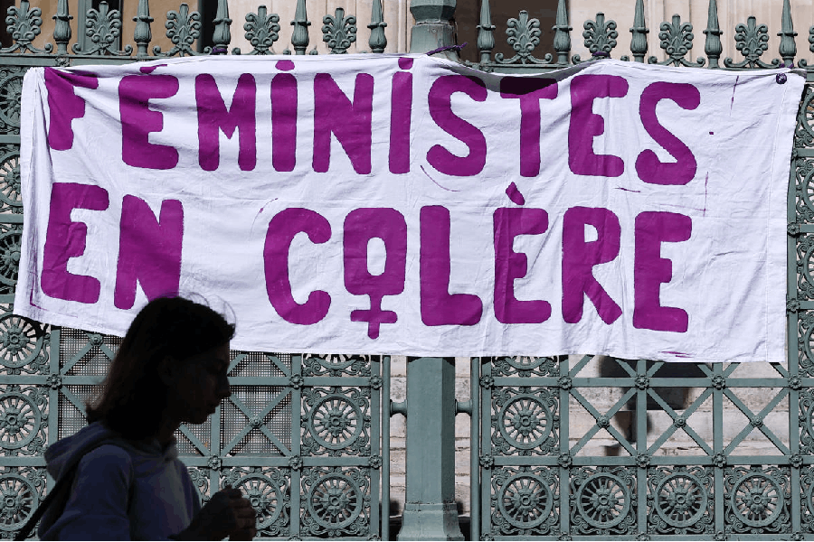 A woman walks past a banner which reads "Angry feminists" hanging on the gate of the courthouse, in support of French woman Gisele Pelicot, who was the victim of a mass rape orchestrated by her then-husband Dominique Pelicot at their home in the southern French town of Mazan, during a hearing in the appeal trial of Husamettin D., one of the 51 people convicted in her rape trial, in Nimes, France, October 8, 2025. (Reuters)