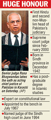 Islamabad, March 24 (PTI): Rana Bhagwan Das, the only Hindu judge in Pakistan’s supreme court, today took over as the acting chief justice and will now head the Supreme Judicial Council which is hearing charges against suspended Chief Justice Iftikar Chaudhry.