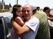 | A man clutches a child in Bent Jbail, south Lebanon, while fleeing from the bombed village of Aitaron. (Reuters) |