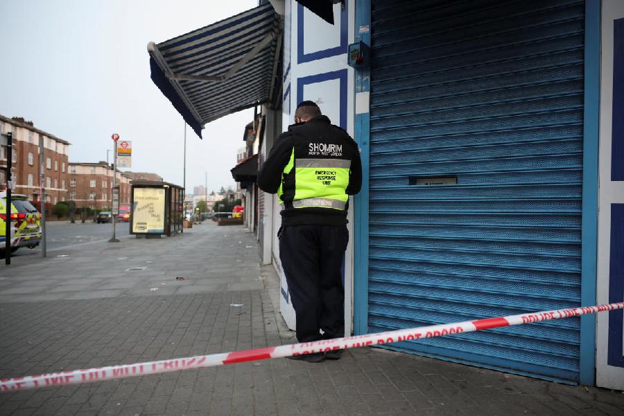 A member of Shomrim, a community security patrol group operating in Jewish neighbourhoods, stands behind a police cordon line near the scene, after four ambulances belonging to Hatzola, a Jewish community organisation, were set on fire in an incident that the police say is being treated as an antisemitic hate crime, in northwest London, Britain, March 23, 2026.