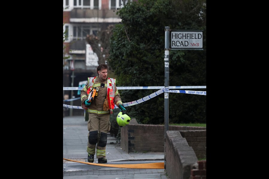 A firefighter walks at the scene after four ambulances belonging to Hatzola, a Jewish community organisation, were set on fire in an incident that the police say is being treated as an antisemitic hate crime, in northwest London, Britain, March 23, 2026.